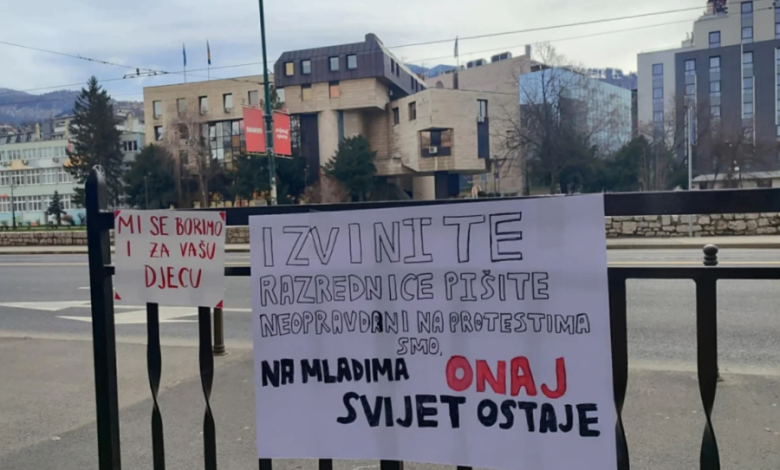 Na fotografijama se vidi transparent postavljen na ogradi, s porukama upućenim razrednici: “Mi se borimo i za vašu djecu” i “Izvinite razrednice, pišite neopravdani, na protestima smo. Na mladima onaj svijet ostaje”.