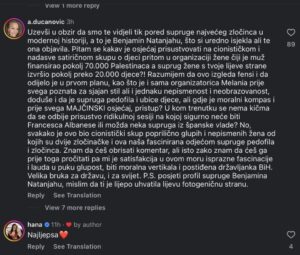 Iako je Mirela Bećirović na svom Instagram profilu postavila fotografiju sa koje je iskružila Saru Netanjahu, brojni građani, i naoročito građanke Bosne i Hercegovine negoduju i osuđuju.