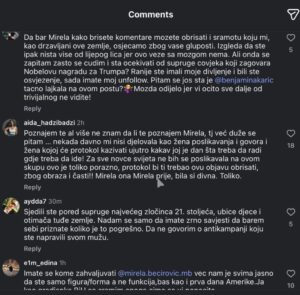 Jedno od pitanja supruzi Denisa Bećirovića je i zašto briše komentare građanki. “Da bar Mirela, kako brišete komentare, možete obrisati i sramotu koju mi, kao državljani ove zemlje, osjećamo zbog vaše gluposti.”