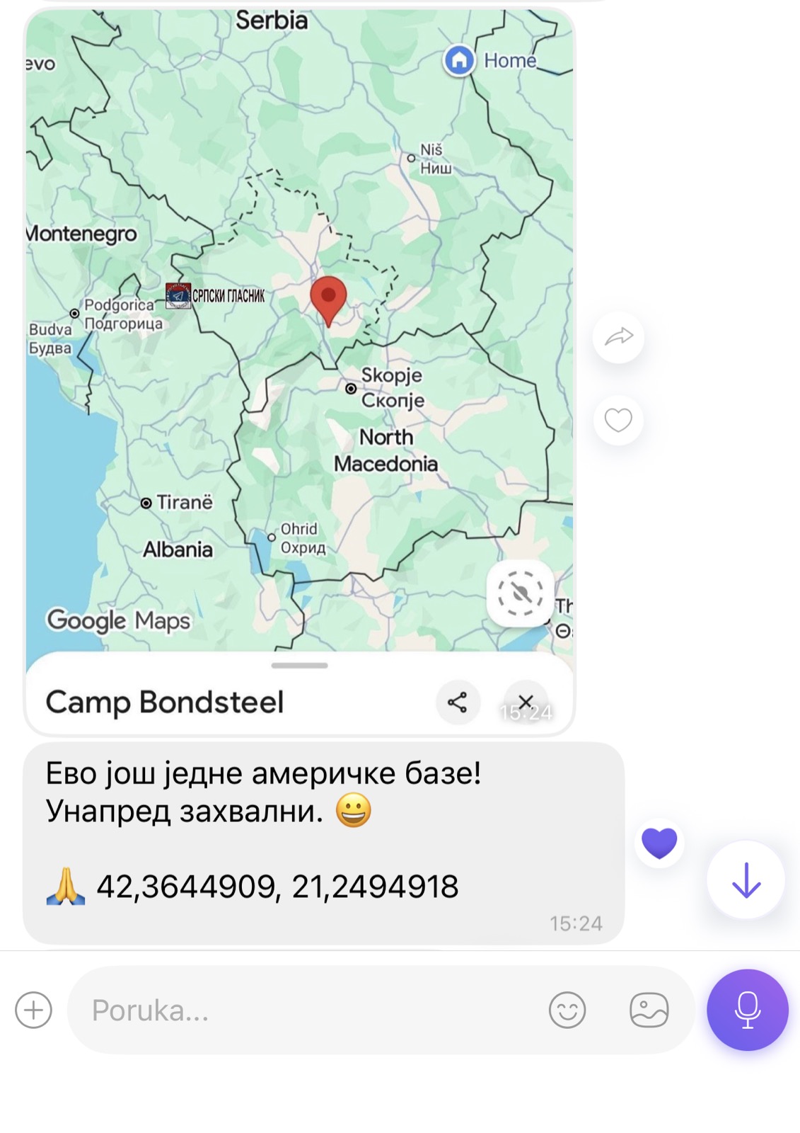 No, neki drugi Srbi imaju drugačije prioritete. Tako pojedinci na društvenim mrežama pozivaju Irance da gađaju američke baze na Kosovu. Pritome, navode i koordinate američke baze na Kosovu.