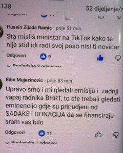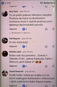 Konakoviću je poručeno da “radi posao ministra”, da “pogleda šta će Tramp mlađi u Banjoj Luci”, “pusti se Karleuše i Željka Mitrovića”, “ministar na TIK Toku kako te nije stid”, “ti si konj”, “Dodik hoda po svijetu i lobira, a ti se baviš Zadrugom”, “jadan je onaj ko te sluša”, itd.